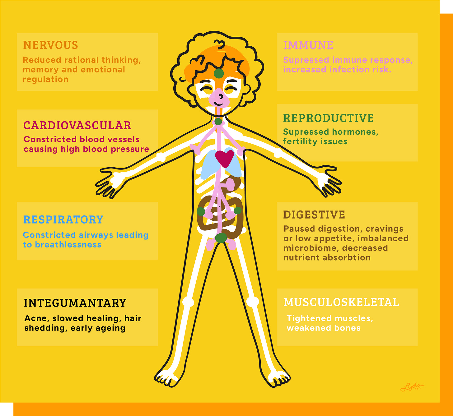 It starts in the brain, then produces chemicals that swim around your body via your blood. These chemicals stick to various body systems using things called “receptors” (imagine little docking stations). Once the chemicals dock they change the way that body system behaves. Viola, stress state.